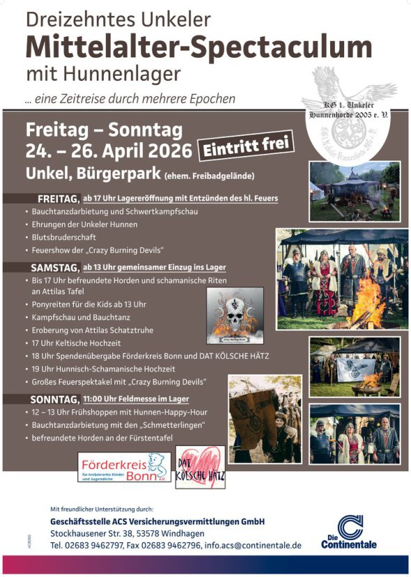 Wir veranstalten einmal im Jahr ein Lager (Unkeler Mittelalter Spektaculum <UMS>), dies ist immer Ende April , wo wir unsere Jurten aufschlagen und ein Wochende lang mit befreundeten Horden, Clans, Vereinen, Gruppierungen uvm. Unkel übernehmen.